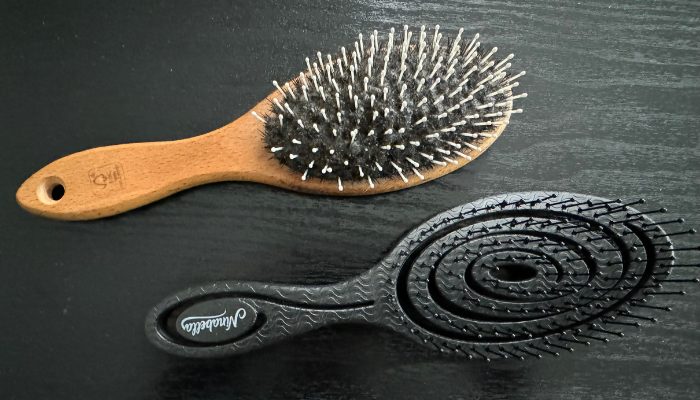 Zuerst werden alle Haare aus der Bürste entfernt. Dazu kann man einen schmalen Kamm benutzen oder Bürstenreiniger*. Hartnäckige Haare entfernt man mit einer Pinzette und bei festen Haarknötchen hilft eine Nagelschere. Für die Nassreinigung gibt es verschiedene Möglichkeiten.